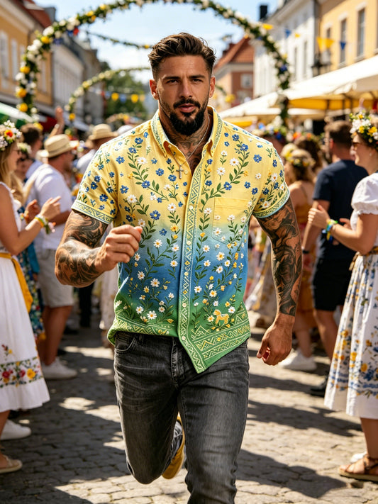 Herrpolotröja med konsttryck – Svensk midsommarfest